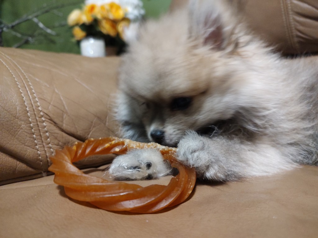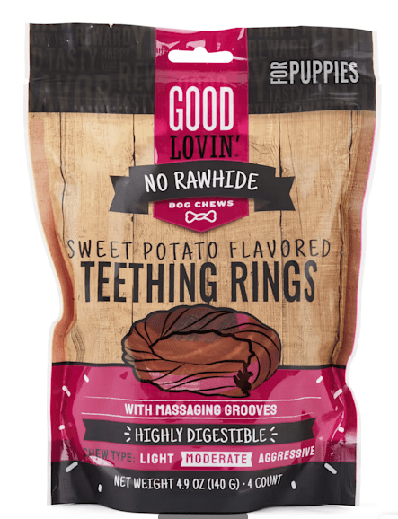 So I desperately tried finding things for him to nosh on. I tried lots of things but by far the best thing he liked are these sweet potato rings. This is exactly what I buy that Schnuggie loves, Good Lovin No Rawhide Sweet Potato Flavored Teething Rings.