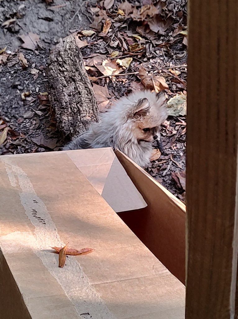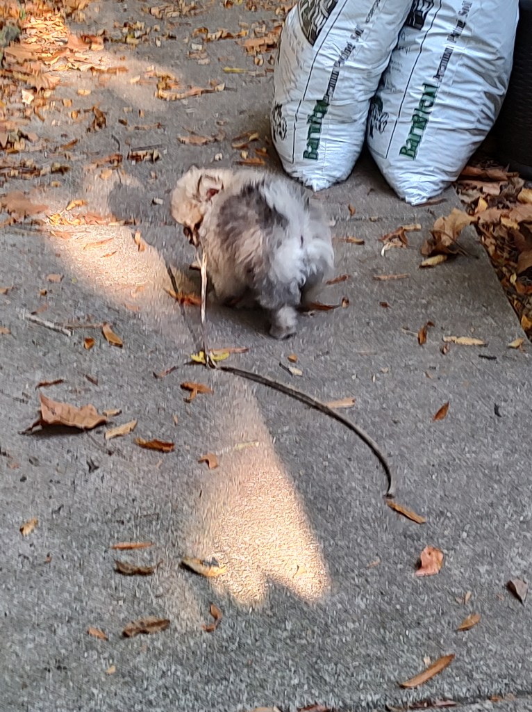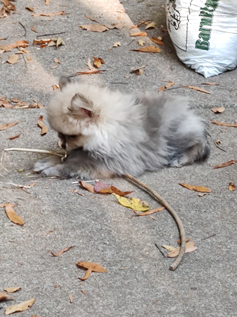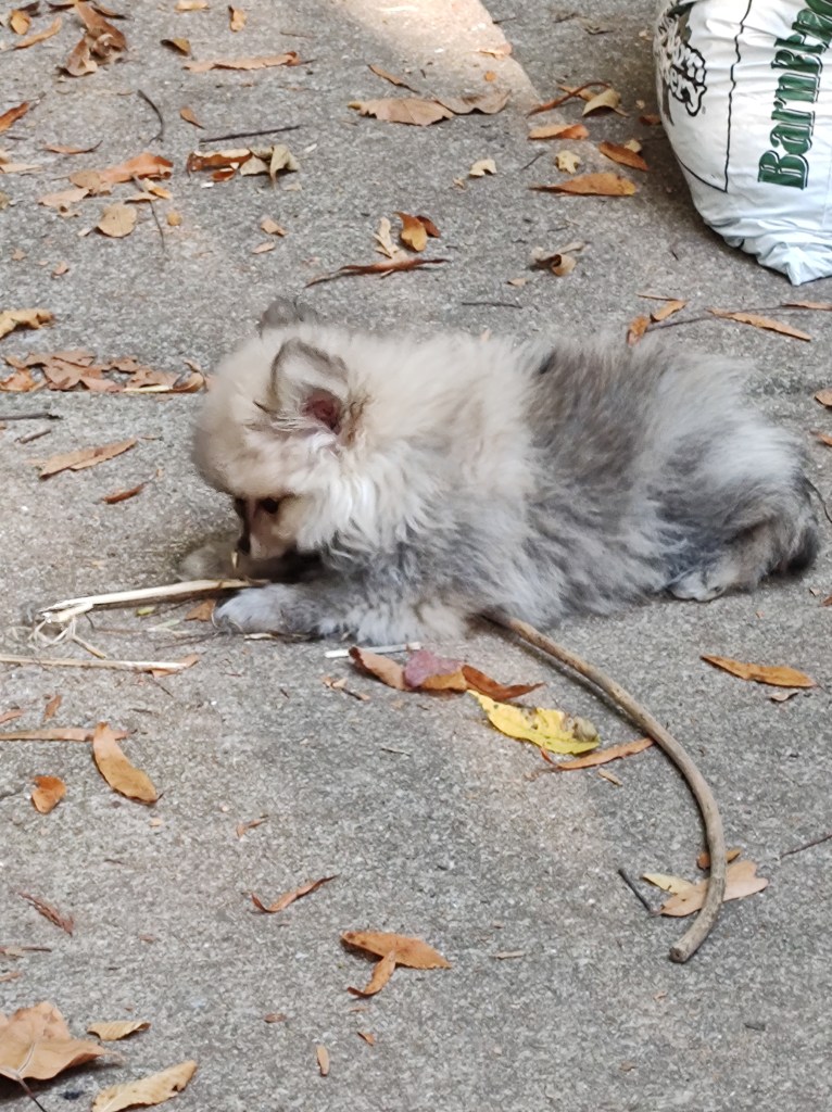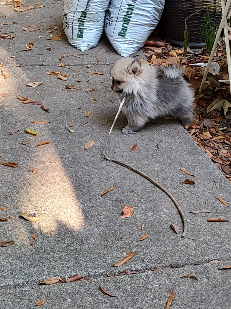 Someone discovered sticks and leaves. Everything is so much bigger than him.