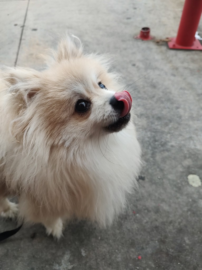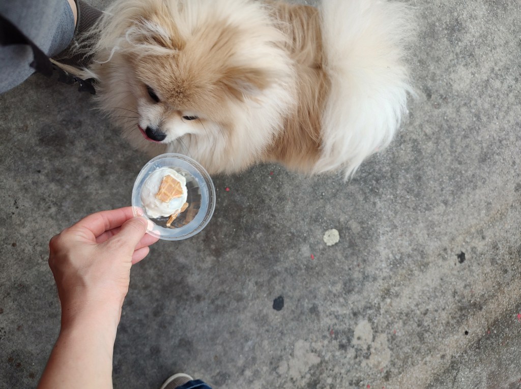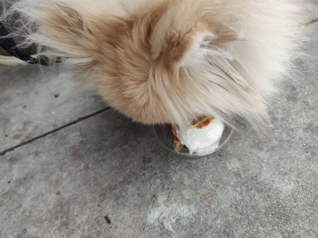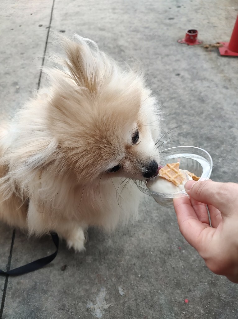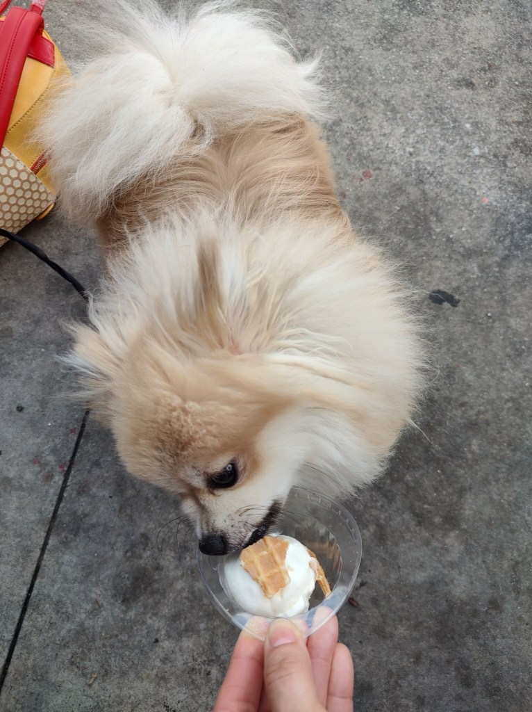 It was a hot day. He had never had ice cream before. He really loved it. Bruster’s is awesome in that they have special little ice creams for the fur babies.