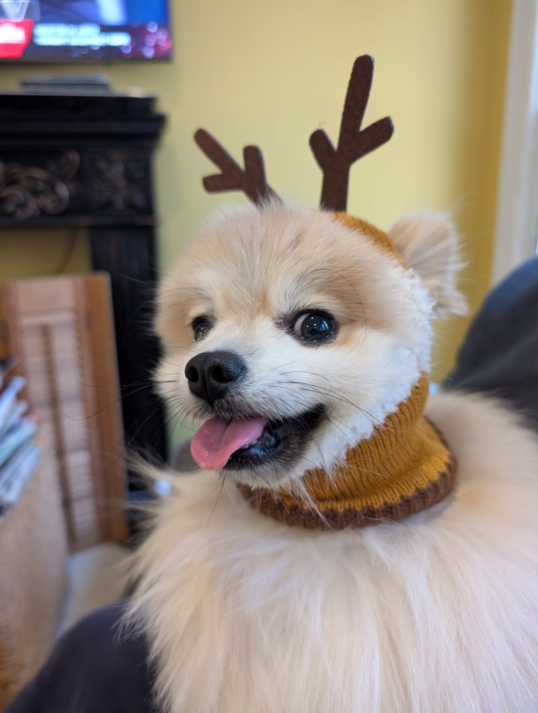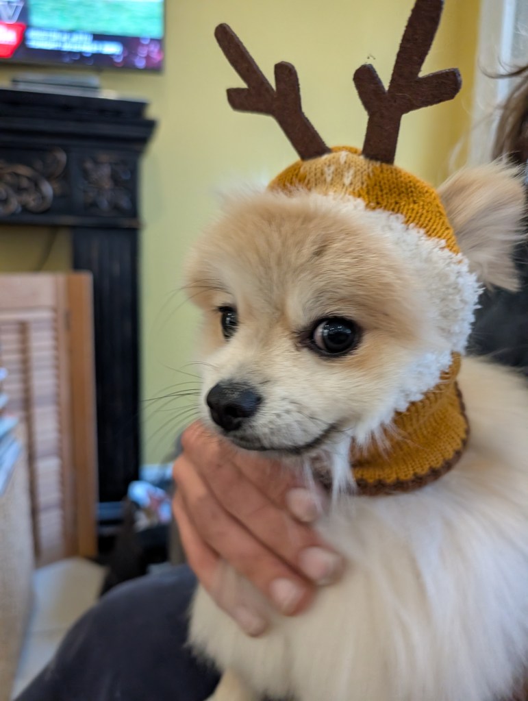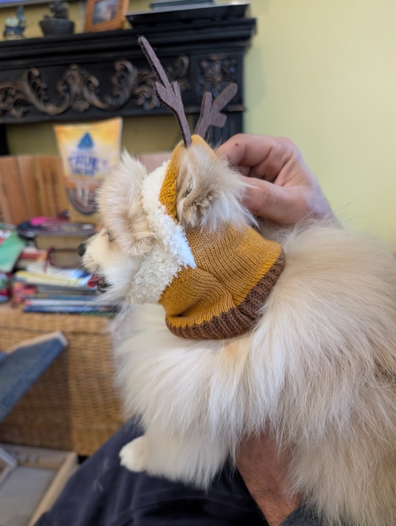 I also bought him a reindeer hoodie beanie hat. Because he is so poofy, it makes him look extra goofy. I bought everything at Petco. He is 8 pounds now and 5 of that is fur, lol.